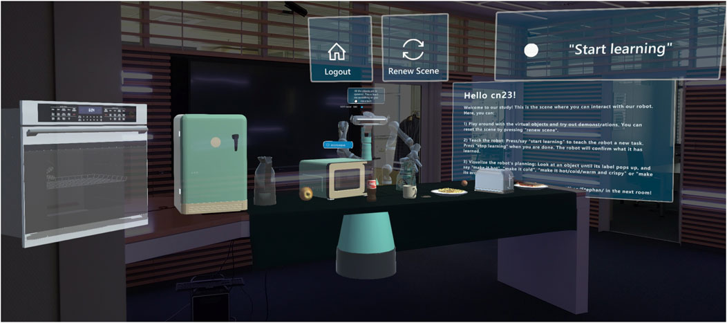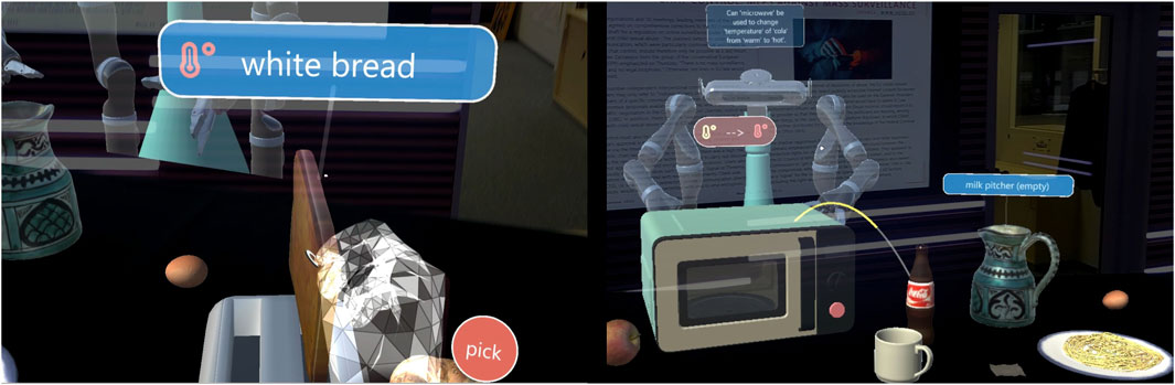 Left: Design elements for online feedback to the tutor about recognized actions and objects. Right: after the demonstration, the robot asks questions to generalize the demonstrated skill (here, after seeing heating milk in the microwave, it asks the tutor “Can microwave be used to change the temperature of cola from warm to hot?“) along with virtual graphic overlays.